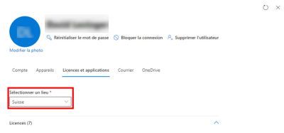 - Dans https://admin.microsoft.com/Adminportal, assurez-vous que le pays renseigné soit bien “Switzerland”